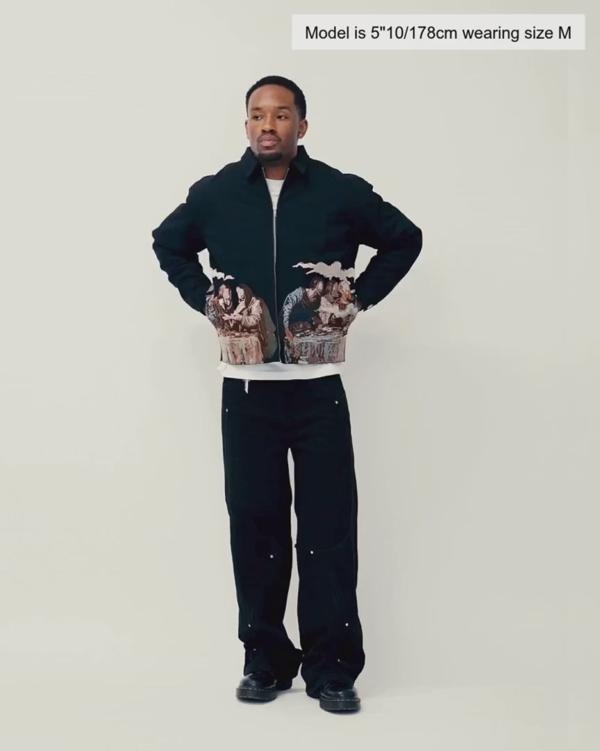 Czarna płócienna kurtka z dolnymi panelami z przodu i z tyłu ozdobionymi ponad 2 milionami szwów, tworzącymi nową wersję Ostatniej Wieczerzy Leonarda da Vinci w stonowanych, jasnych barwach. Wykończona metalowym zamkiem błyskawicznym i specjalnymi okuciami Vescartes, łączy historyczną sztukę z nowoczesną strukturą streetwearową.