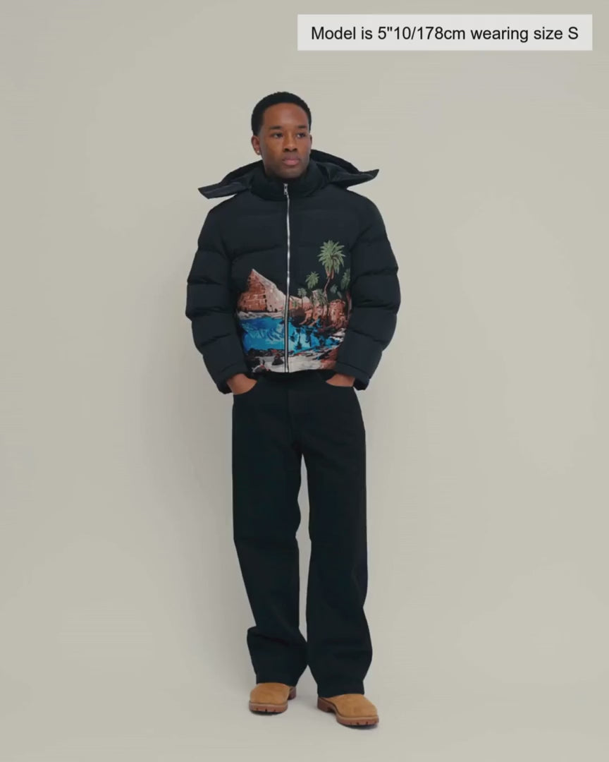 Wykonana w kolorze głębokiej czerni, kurtka puchowa Rihla Puffer wyróżnia się efektownym haftem, który otula kurtkę niczym ruchomy mural. Odpinany kaptur dodaje jej wszechstronności, a pustynny krajobraz – wędrowcy, wielbłądy, palmy, woda – rozpościera się gęstym, precyzyjnym ściegiem, przekraczającym 2 miliony ściegów.